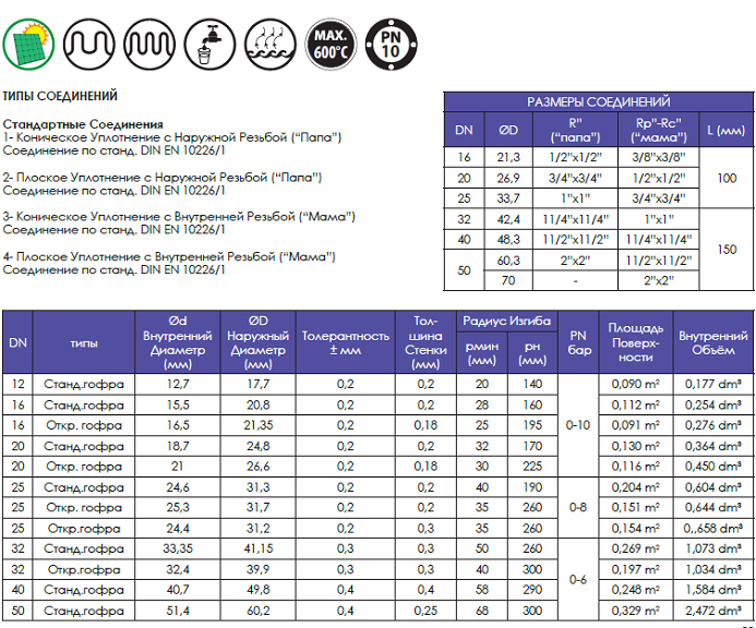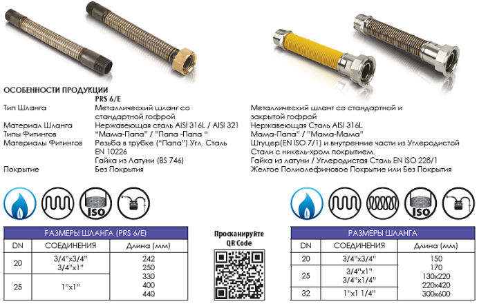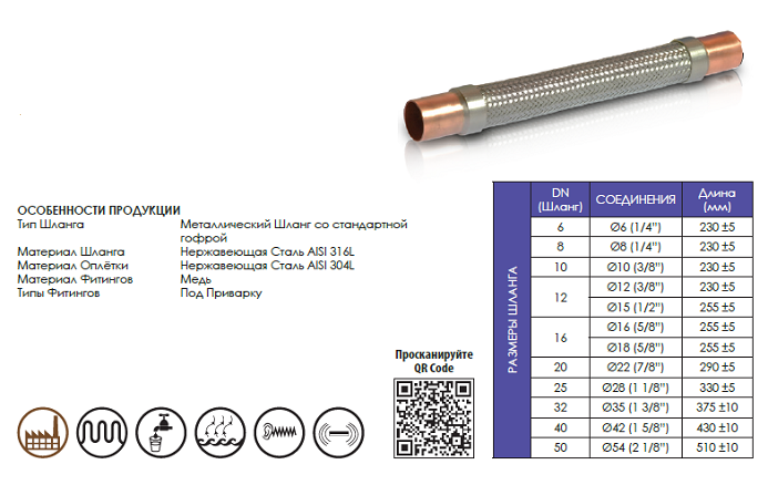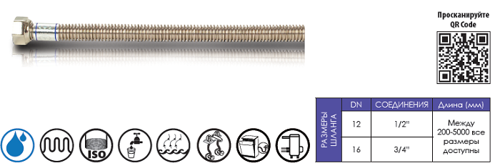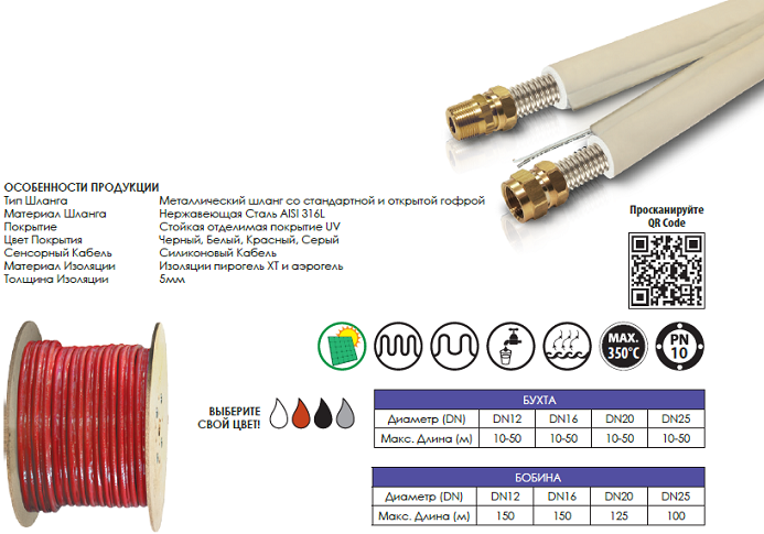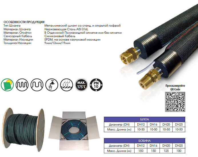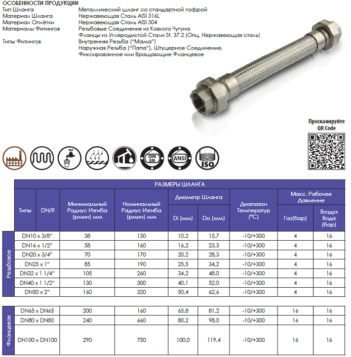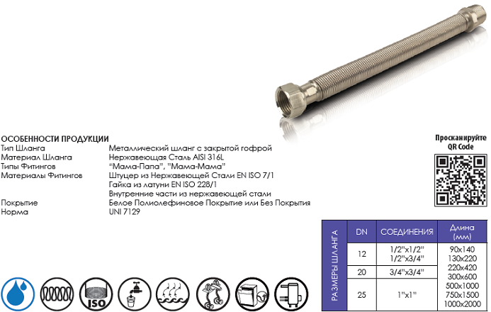 Материал Шланга: Нержавеющая Сталь AISI 316L (1.4404) по станд EN ISO 10380